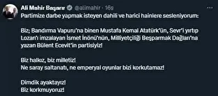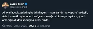 Başarır’ın açıklamalarına sosyal medyadan yanıt veren Tekin, “Ali Mahir, çok zıpladın; haddini aştın — sen Bandırma Vapuru’na değil, Aziz İhsan Aktaşların ve itirafçıların kayığına binmeye layıksın; şimdi anladığın dilden konuşma sırası bizde…” ifadelerini kullandı.