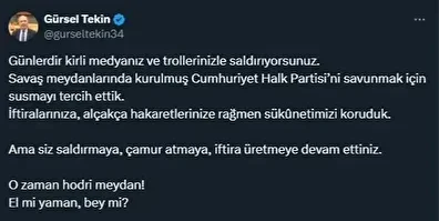 Tekin, yandaş medya ve partili fondaşlara da tepki gösterdi: “Günlerdir kirli medyanız ve trollerinizle saldırıyorsunuz. Savaş meydanlarında kurulmuş Cumhuriyet Halk Partisi’ni savunmak için susmayı tercih ettik. İftiralarınıza, alçakça hakaretlerinize rağmen sükûnetimizi koruduk. Ama siz saldırmaya, çamur atmaya, iftira üretmeye devam ettiniz. O zaman hodri meydan! El mi yaman, bey mi?”