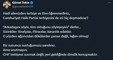 Tekin, Başarır’a yönelik eleştirilerini şu sözlerle sürdürdü: “Hadi ailenizden terbiye ve töre öğrenmediniz, Cumhuriyet Halk Partisi terbiyesini de mi hiç duymadınız? ‘Arkadaşını söyle, kim olduğunu söyleyeyim’ derler… Sizinkiler: itirafçılar, iftiracılar, karanlık odaklar. O yüzden ağzınızdan dökülenler çamur değil, lağım olmuş! Biz susunca sustuğumuzu sandınız. Ama unutmayın: CHP terbiyesi susmak değil, yeri geldiğinde dimdik konuşmaktır.”