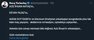 “AZİZ İHSAN AKTAŞ’ın, ERTAN YILDIZ’ın, ADEM SOYTEKİN’in ve bilumum itirafçının arkadaşları kongrelerde yine tek kale maç yapıyor; akıllarınca rol kesiyor; zıpladıkça zıplıyorlar… Aslında size cevap vermeye bile değmez Aziz İhsan’ın arkadaşları… Sizin muhatabınız Aziz İhsan ve onun ithamlarıdır… Cevap vermek yerine hedef şaşırtmaya çalışıyor ve avazınız çıktığı kadar bağırıyorsunuz. Neden mi? Nedeni çok basit! Çünkü SUÇLULARIN TELAŞI içindesiniz! Çok bağırarak suçlarınızın üstünü örtebileceğinizi sanıyorsanız yanılıyorsunuz. Allah kimseyi Aziz İhsan’ın suçlarına ortak olacak hale düşürmesin… Allah kimseyi Adem Soytekin’e cevap veremeyecek hale getirmesin… Allah kimseyi sizin düştüğünüz çukura düşürmesin… Tek bir gece bile huzur içinde uyuyamıyorsunuz. Tek bir gününüz bile neşe içinde geçmiyor. ‘Acaba nerede ne patlayacak?’ diye korkuyla yaşıyorsunuz. Çünkü suçlarınızı en iyi siz biliyorsunuz! 102 yıllık çınarımızın yapraklarını sararttınız. O çınara pisliklerinizi bulaştırdınız. Şimdi pisliklerinizi örtmek için bağırıyor çağırıyor, çırpındıkça çırpınıyorsunuz. Bu neyin telaşı? Bu neyin korkusu? Bağırtın daha çok bağırın… Bataklığa gömülürken elini havaya kaldırıp feryat edenlere benziyorsunuz. Sizi acıyarak ve iğrenerek izliyoruz.”