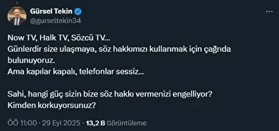 “Now TV, Halk TV, Sözcü TV… Günlerdir size ulaşmaya, söz hakkımızı kullanmak için çağrıda bulunuyoruz. Ama kapılar kapalı, telefonlar sessiz… Sahi, hangi güç sizin bize söz hakkı vermenizi engelliyor? Kimden korkuyorsunuz?”